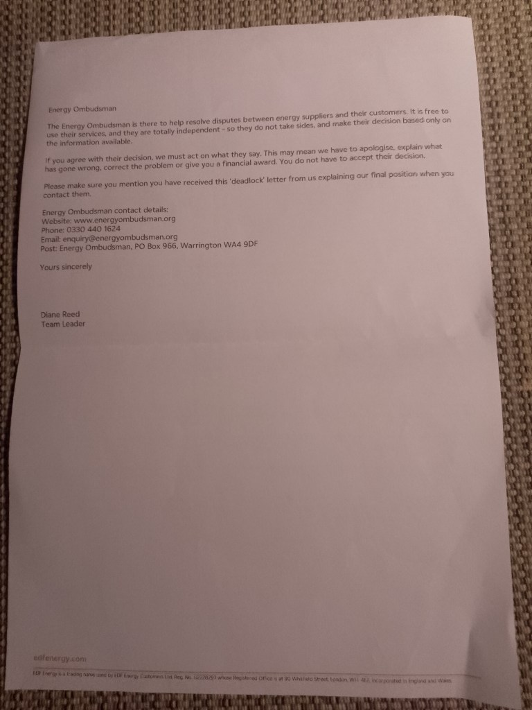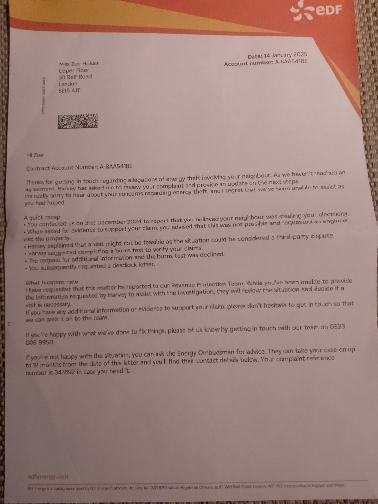 She is even stealing part of my gas outlet supply by way of the meters outside the main frontal of the designated property.. I have contacted EDF with my complaints. Which are now under investigation yet it is not apparent which relevant spectrum of the Ofgem department is dealing with the complaints under investigation.