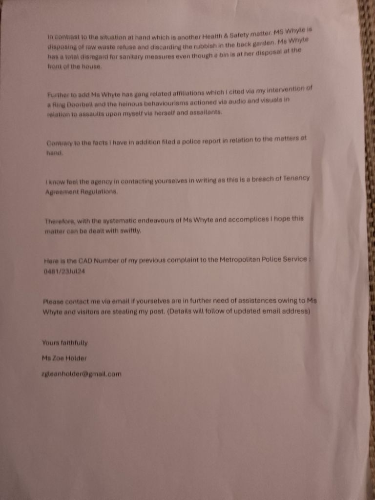 Presently they have allocated a new tenant below me in Flat 1 who is very abusive towards myself. Continually stealing my mail. There is continued drug affiliated activities late at night in relation to her address. I was even informed by the neighbours that individuals tried to break into her property. The Police were called and attended and a person at the property below was detained by the police. I myself have contacted the Police in relation to her behaviour and activities. In addition she is gang affiliated and has a substance misuse habit. She uses the premises as a drug den and brothel. She and her assailants have even made threats against my life and planned to burgle my property and move my household belongings into her property below. I am afraid to leave my property as she continues to threaten to lock me out by changing the locks on the communal front door.